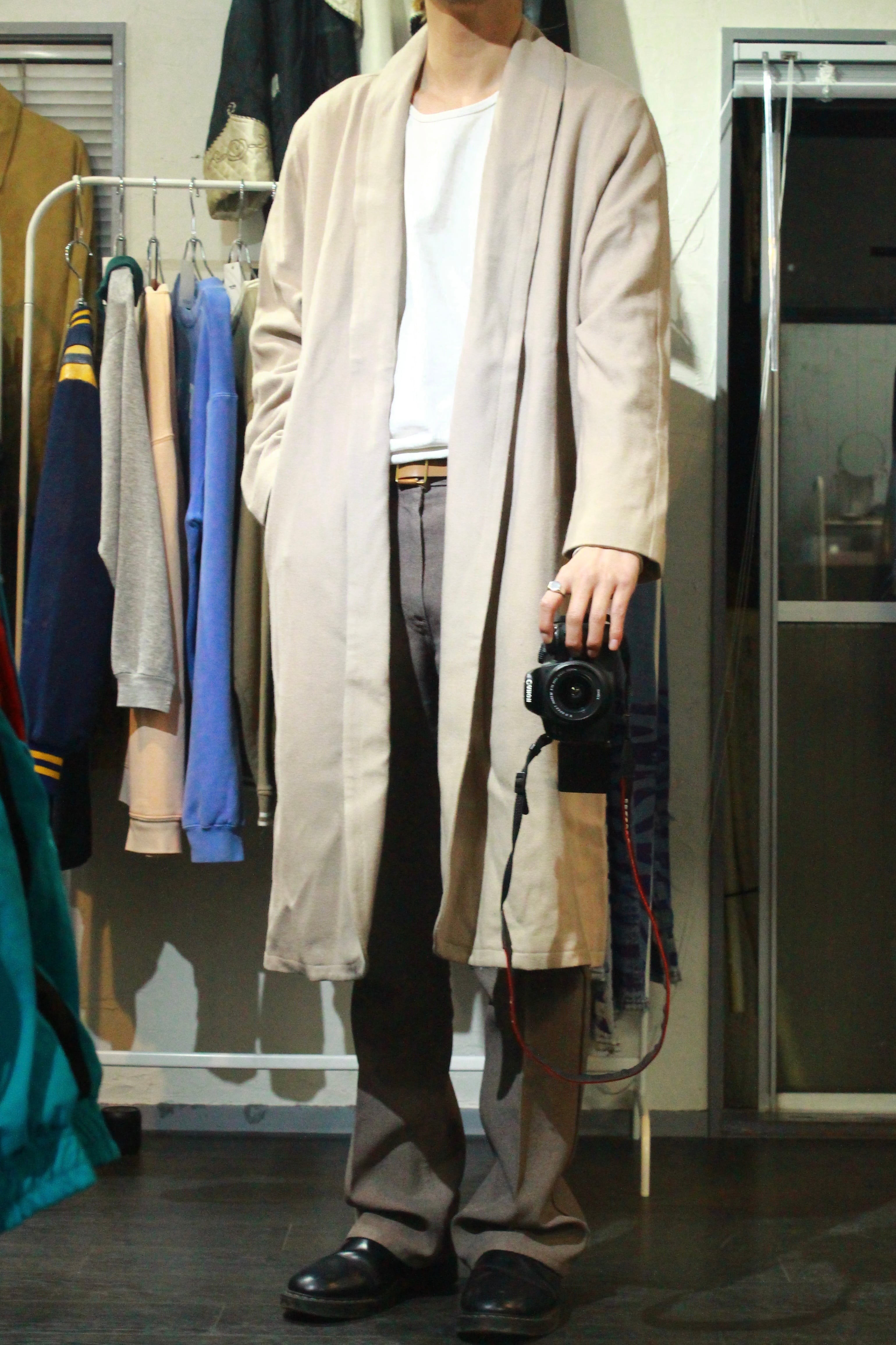 ¥17,600→¥5,000 ウール素材のガウンタイプのロングコート。 デザインを敢えて削ぎ落とすことで、デザインとしたミニマルな一枚。 ボタンのないソリッドなデザインなので、アウターの上からレイヤードの着るのにも◎ ポケットも付いております。 サイズはM-L相当になっております。 [size] M-L相当 着丈 111cm 肩幅 49cm 身幅 59cm 袖丈 61cm ※平置きでの採寸になります。